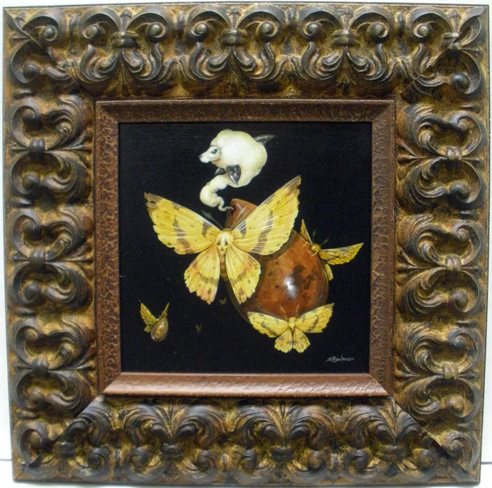 Simkins began drawing at an early age and started doing graffiti under name Craola. Graffiti art became his impetus for creating and gave him the confidence to paint large works. In addition, it taught him perspective, color theory and further developed artistic skills, which later translated into his work with acrylics. His outlandish dreamt of characters are part of a fantasy sideshow, inspired by elements from pop culture, the old masters, nature, carnival kitsch and most importantly, a warped imagination. It is the careful weaving of these elements that makes Greg Simkins a sought after surrealist painter today.